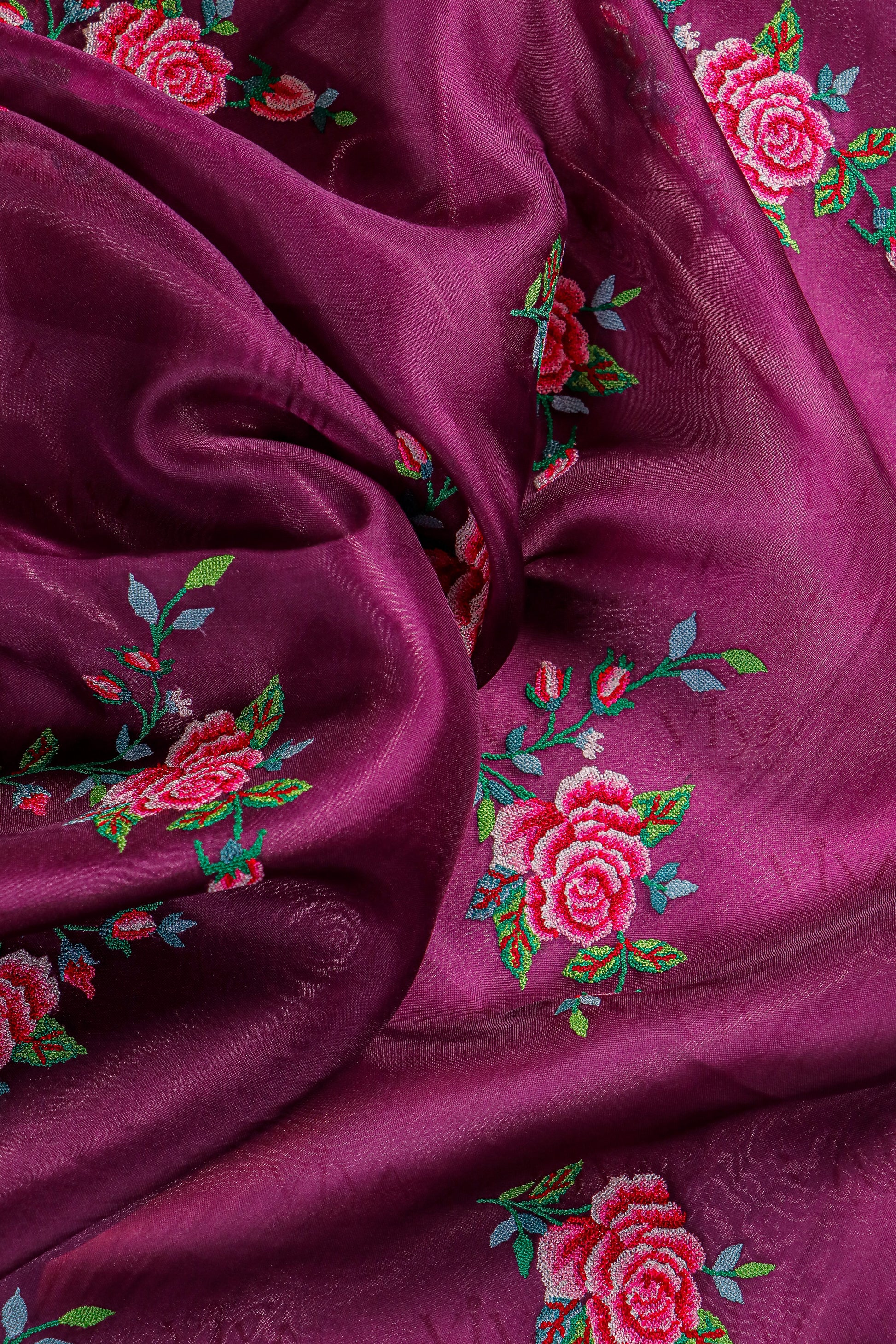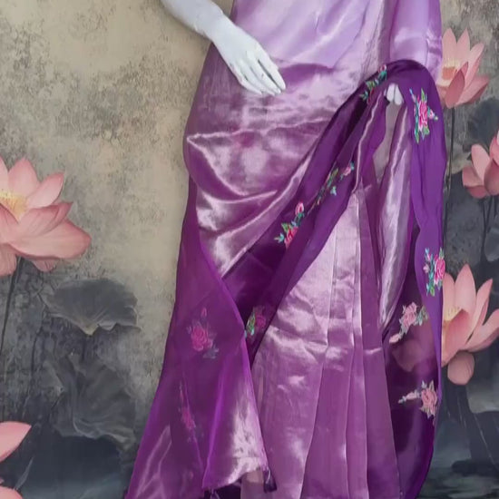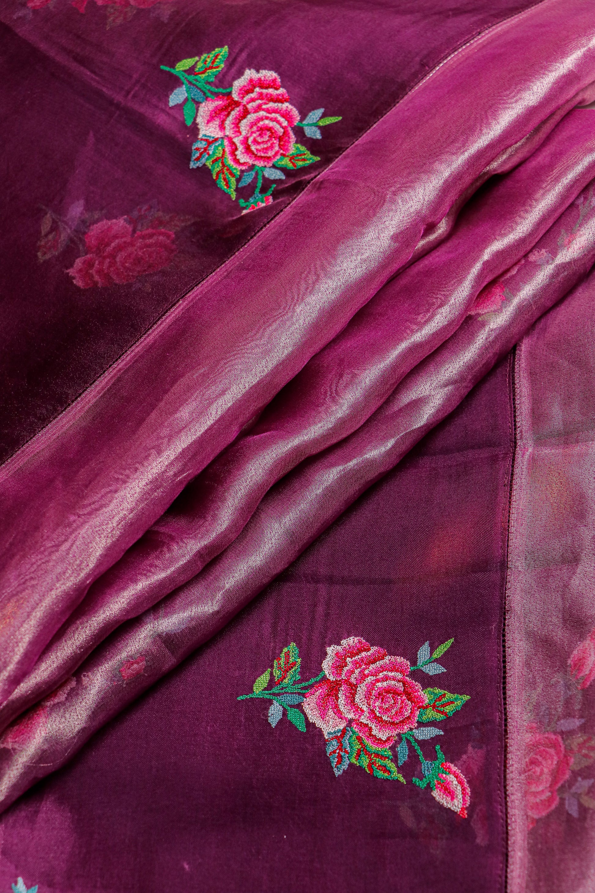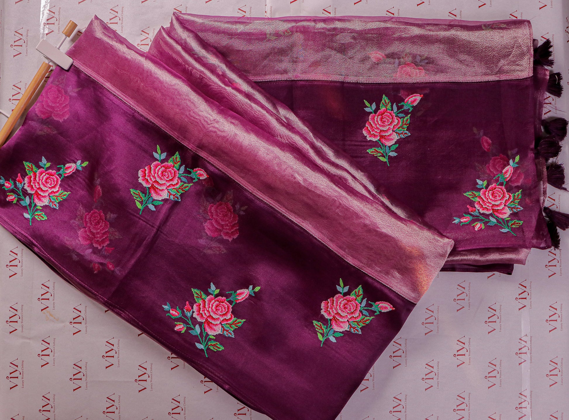 A refined rose plum pure tissue silk saree featuring a delicate kora border and intricate handworked petit point embroidery. Lightweight with a luminous sheen, this piece is crafted for discerning women who appreciate fine craftsmanship, subtle detailing, and timeless elegance.