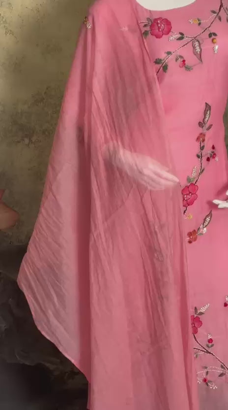 Crafted in airy pure Mul Chanderi, this elegant 3-piece suit features delicate hand-painted florals that add a soft, artistic charm. Light, graceful, and effortlessly luxurious—perfect for refined daytime festivities and intimate occasions.