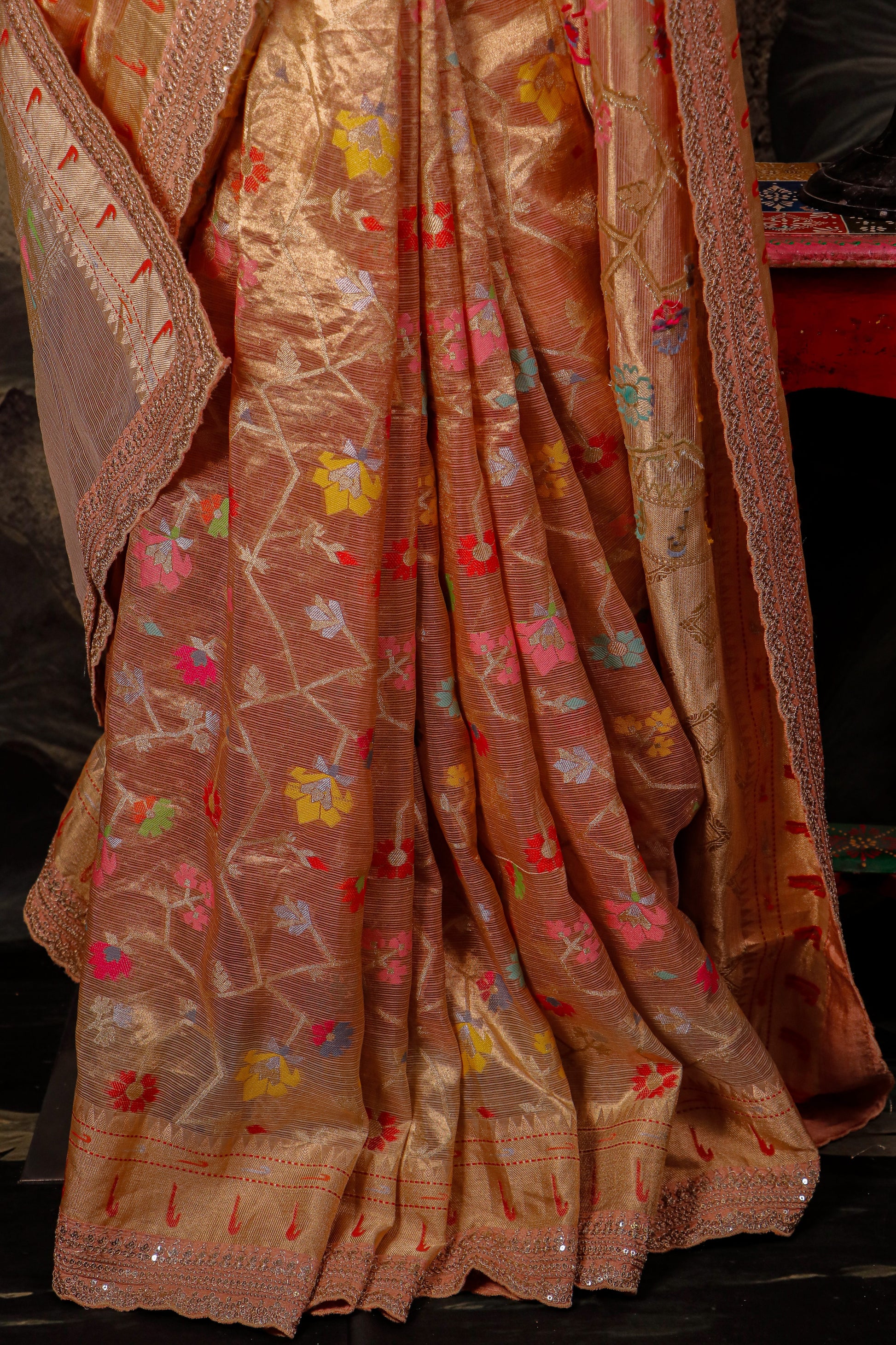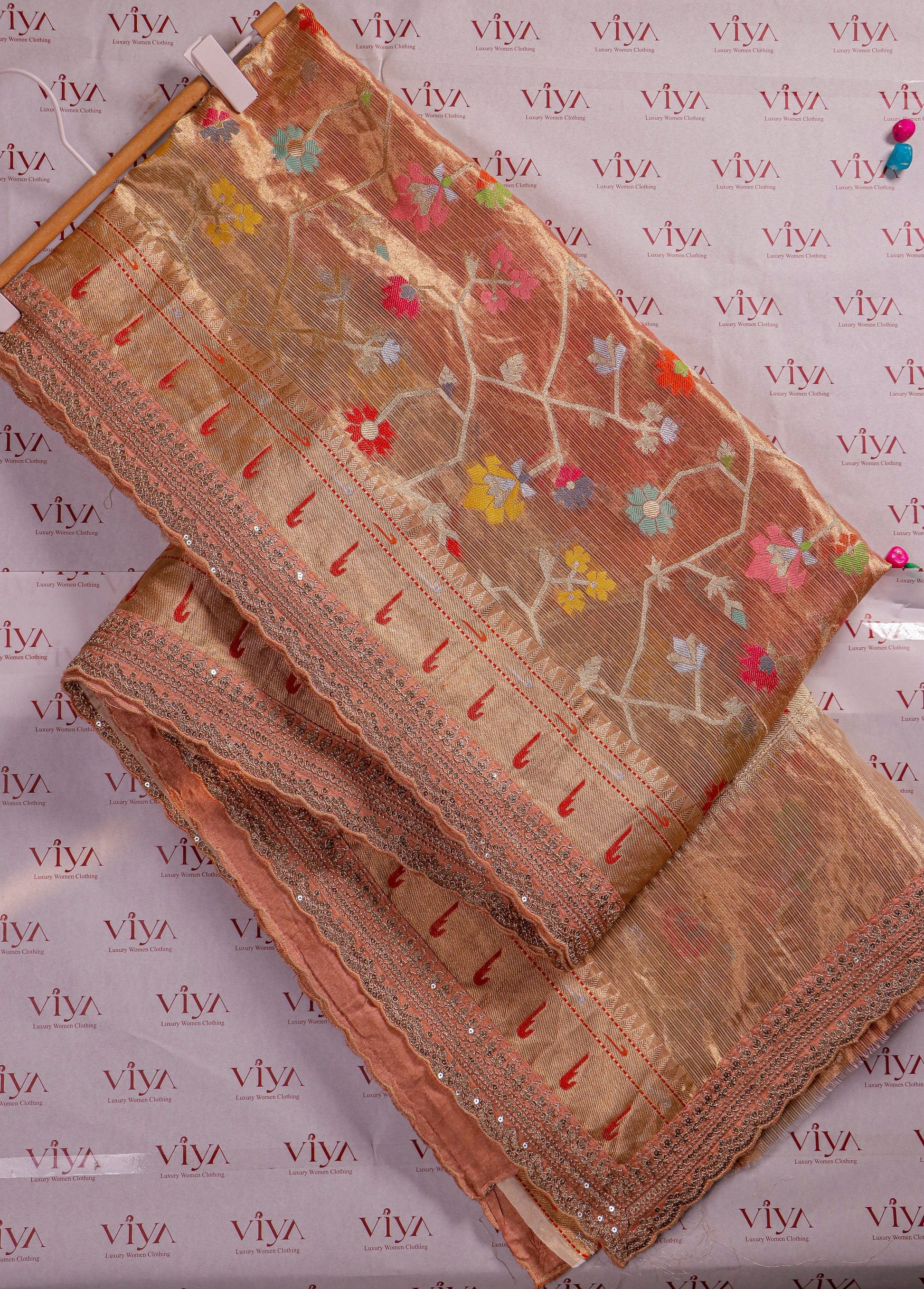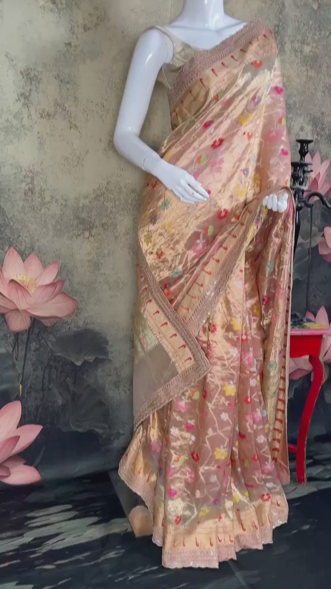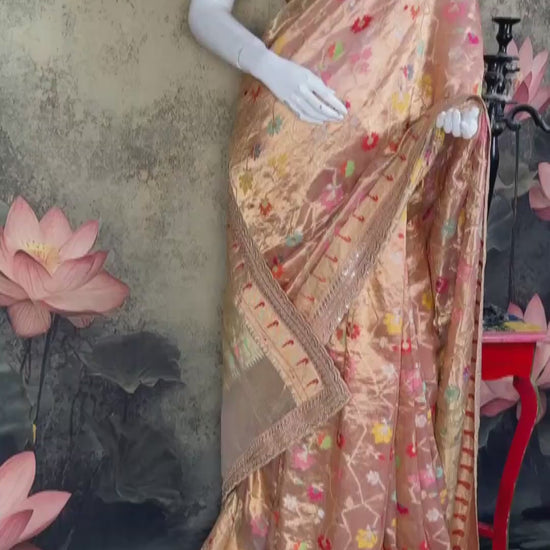 An exquisite pure tissue silk Paithani saree featuring a richly handwoven Paithani border enhanced with traditional meenakari work. The luminous silk base paired with intricate artisanal detailing makes this saree an ideal choice for weddings, festive occasions, and collectors of authentic heirloom weaves.