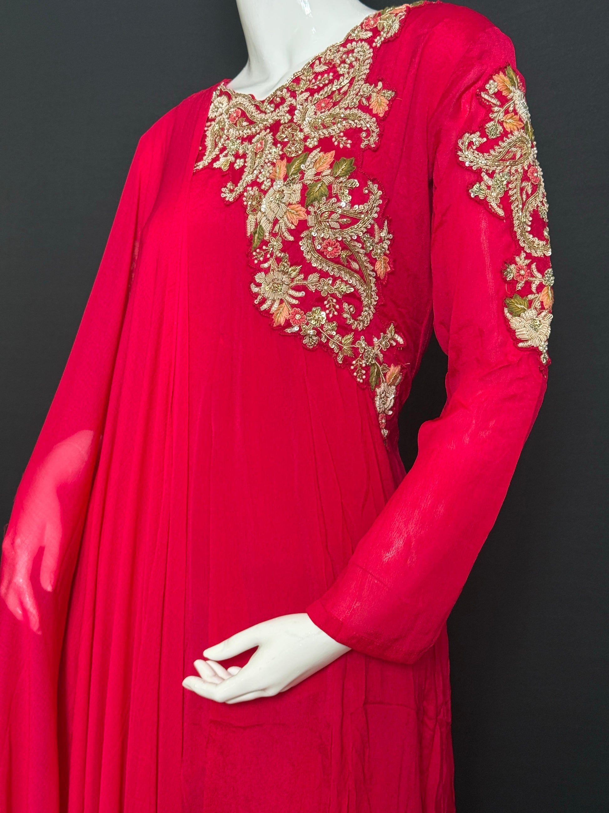 Designed in flowing pure Chinnon georgette, this elegant silhouette is elevated with intricate handwork that adds a touch of regal charm. Graceful, lightweight, and luxurious perfect for festive evenings and special occasions.