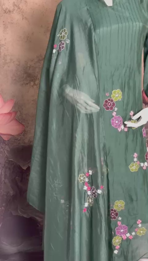 Crafted in luxurious pure Chanderi silk, this elegant piece features delicate hand-painted floral artistry that exudes timeless charm. Lightweight, refined, and effortlessly graceful—perfect for premium festive and occasion wear.