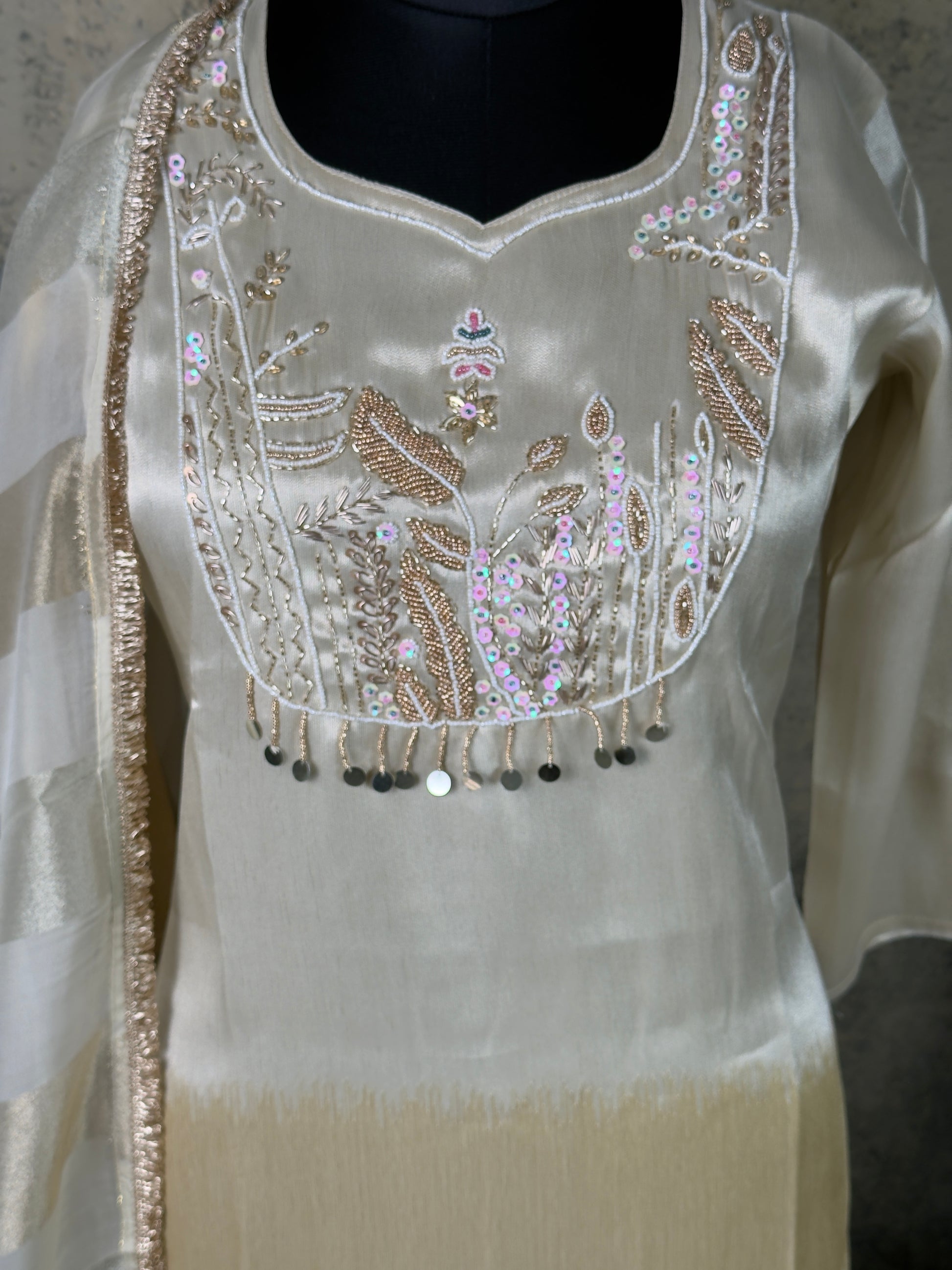 Elegant ivory Kanjivaram tissue silk suit set featuring delicate handwork on the neckline, paired with a matching dupatta and straight pants. A refined outfit ideal for festive occasions, celebrations, and elegant evening wear.