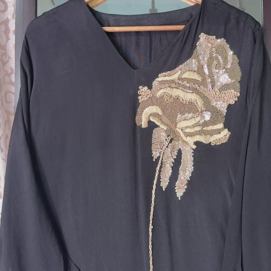 Elegant pure chinnon crepe 2-piece suit highlighted with rich and detailed hand embroidery.