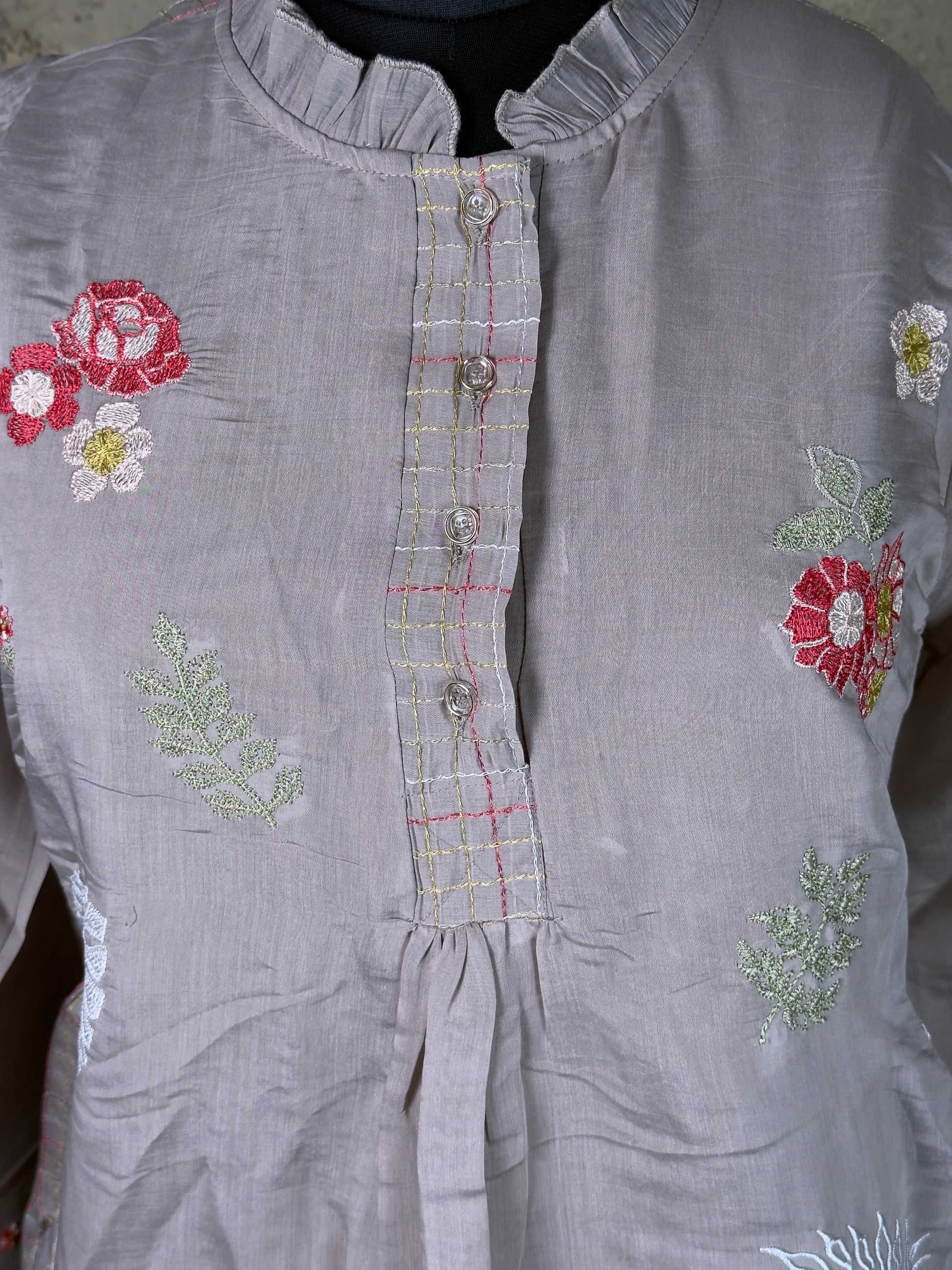 Stylish pure handloom cotton fusion kurta set designed for a modern ethnic look. The kurta features delicate floral embroidery with a soft pleated front and a ruffled neckline, creating an elegant yet relaxed silhouette. Paired with a matching straight cotton pant, this breathable 2-piece set is perfect for casual outings, office wear, and everyday comfort.