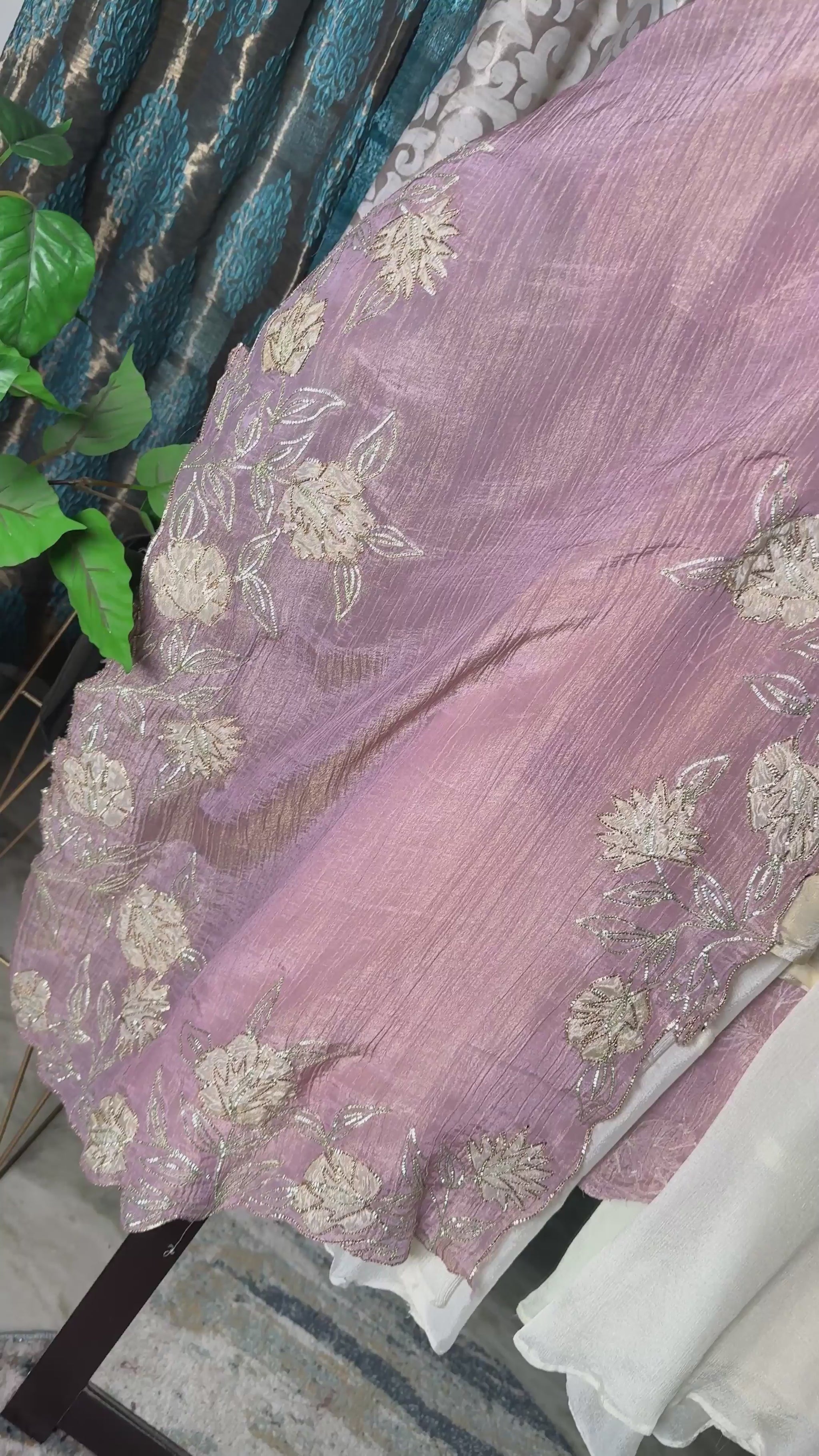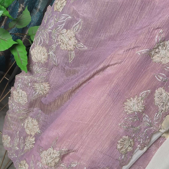 Elegant pure tissue chinnon 3-piece suit featuring delicate applique handwork for a graceful look. Lightweight, premium fabric with a soft finish, perfect for festive occasions and special gatherings.