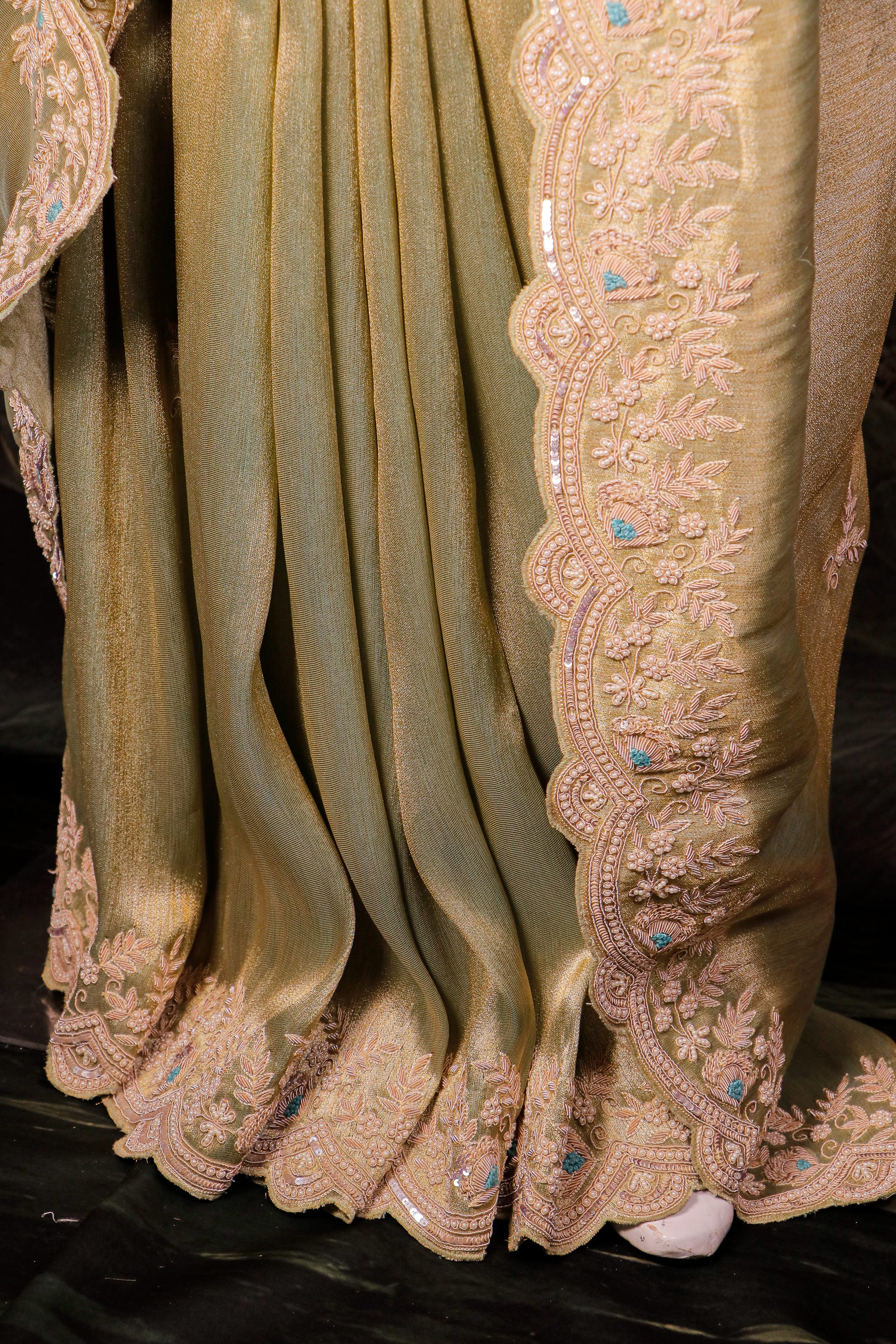 A refined sage gold silk saree featuring an intricately hand-embroidered scalloped border with delicate floral detailing. Finished with a soft natural sheen and fluid drape, this piece is crafted for discerning women who value elegance, craftsmanship, and understated luxury.