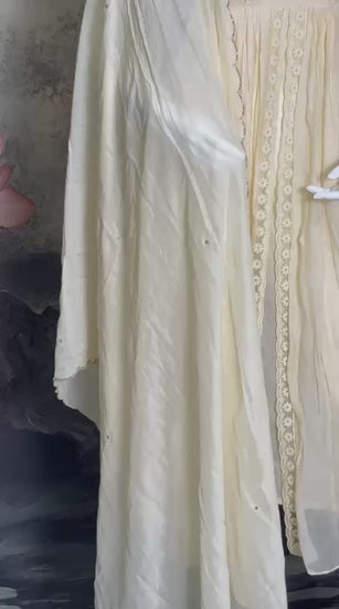 Elegantly crafted in pure Mul Chanderi, this serene ivory ensemble is enhanced with delicate handwork and refined detailing. Light, breathable, and timeless—perfect for graceful daytime occasions and intimate celebrations.