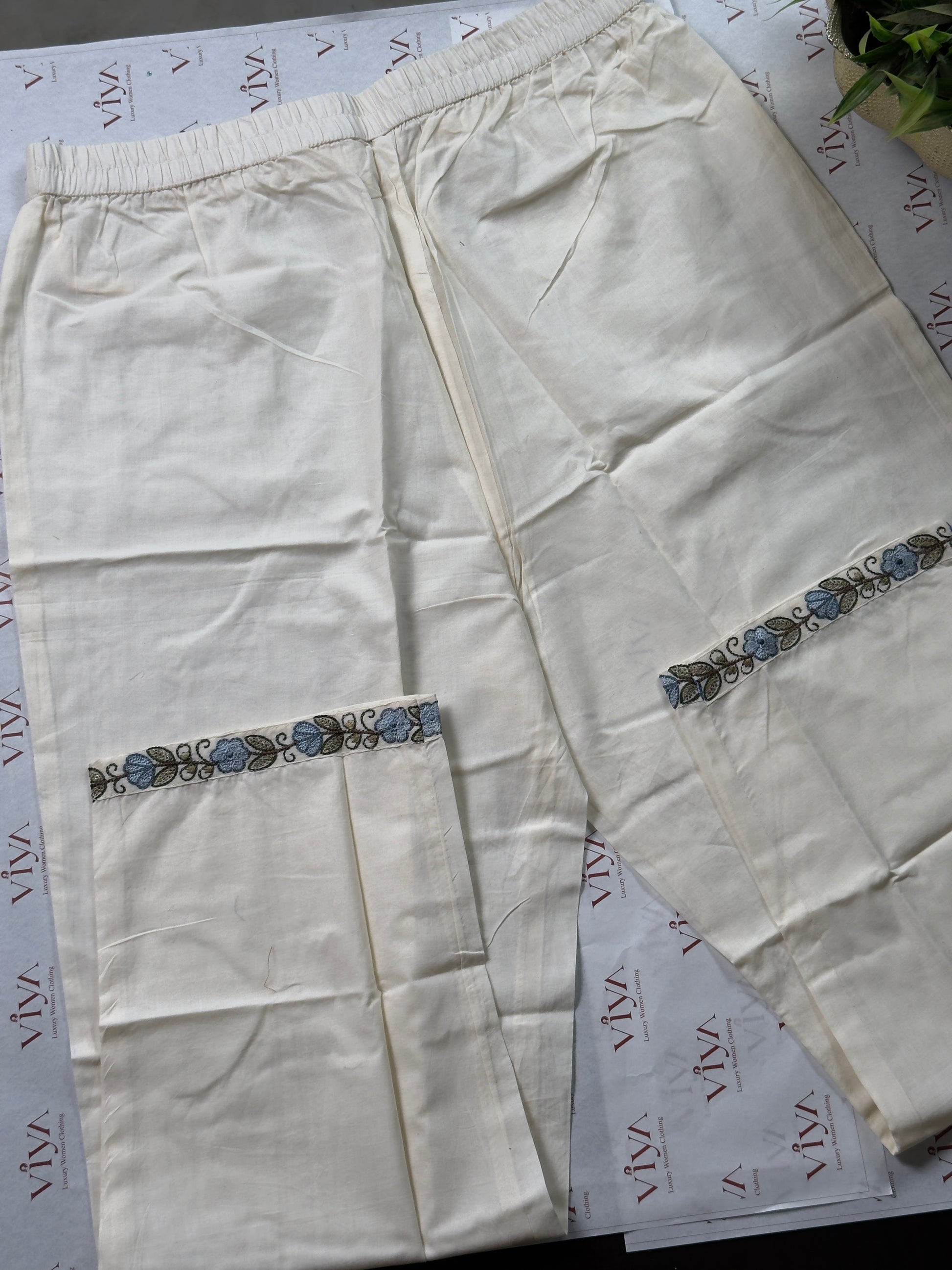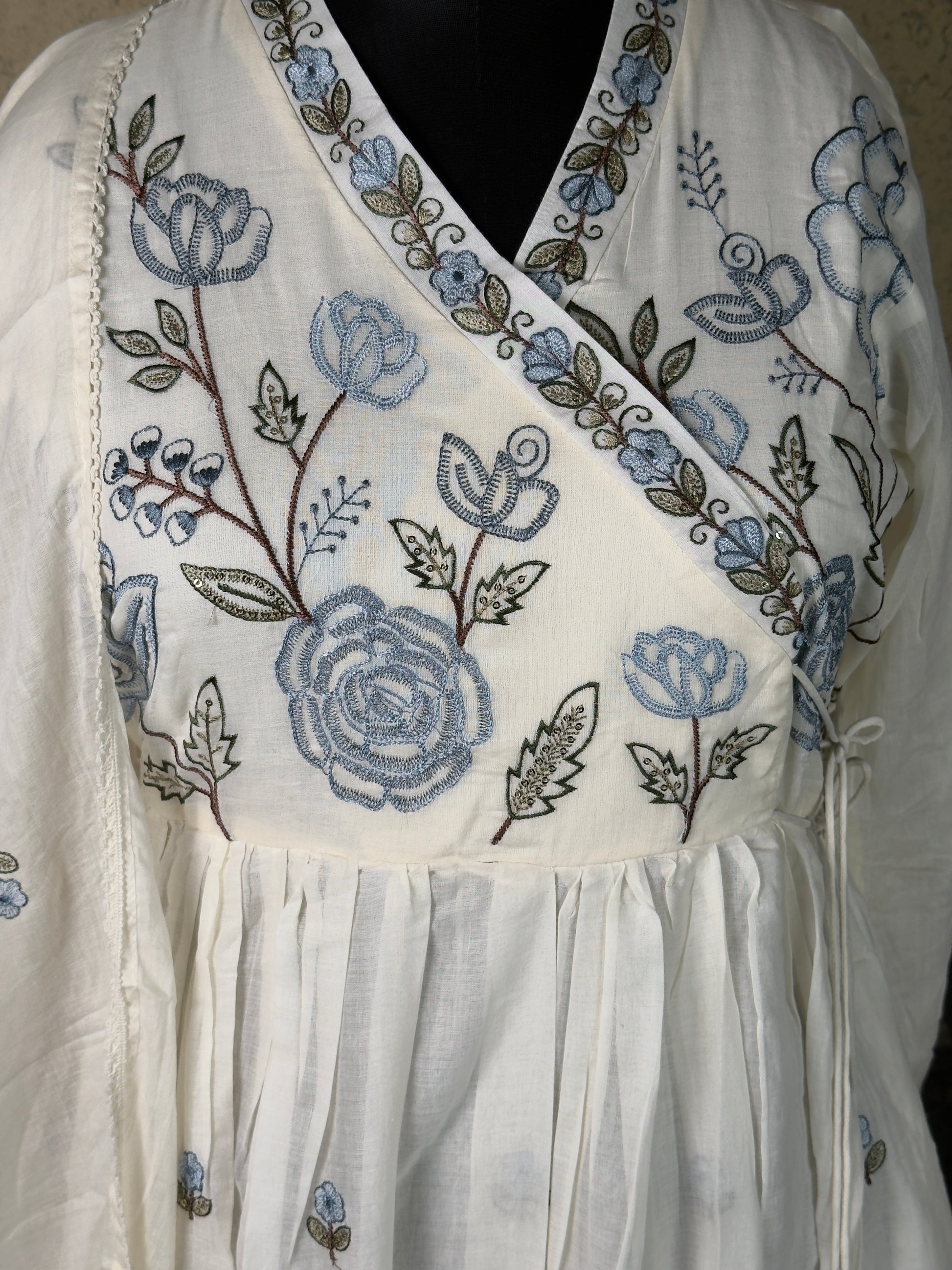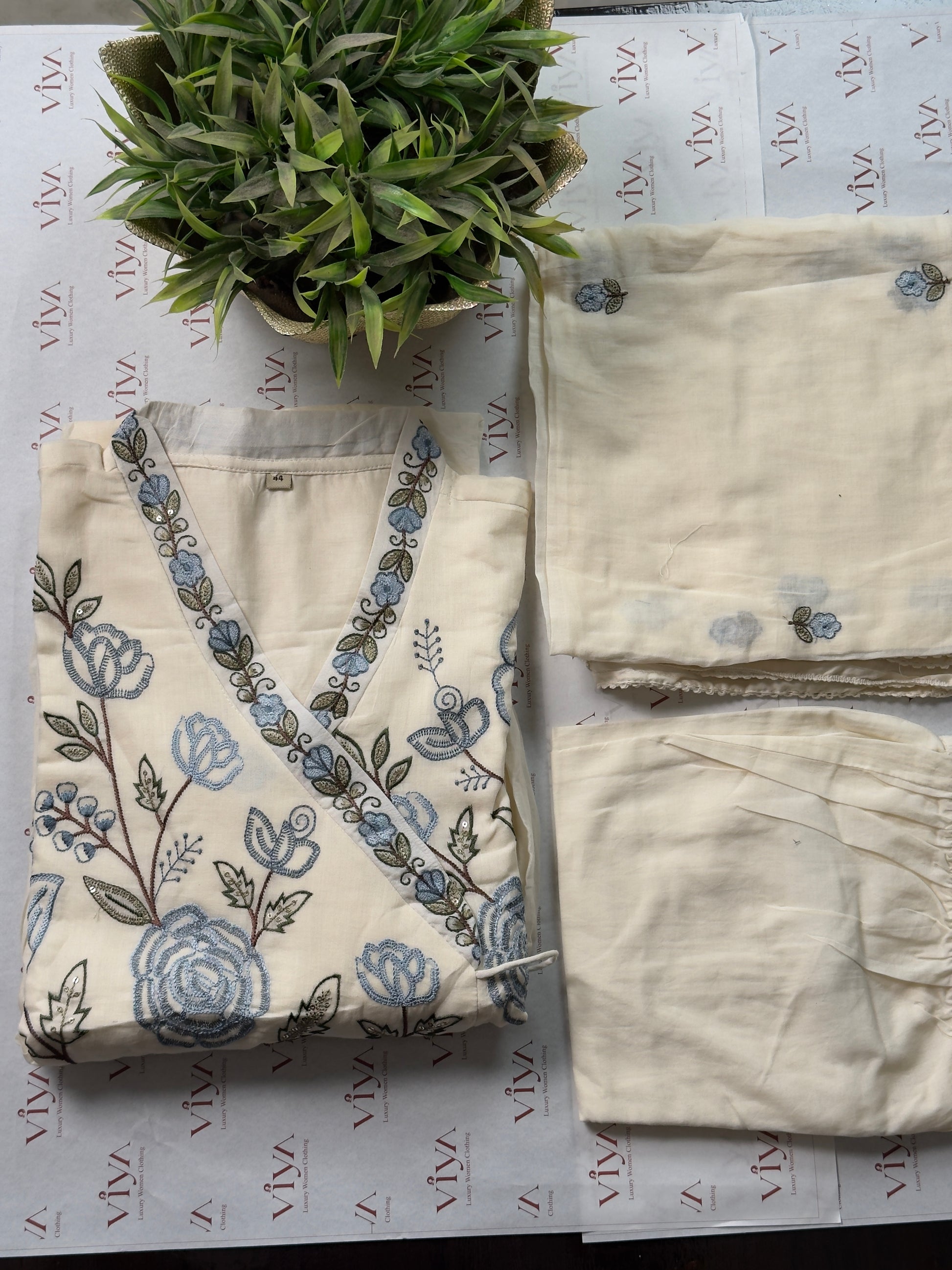 Elegant white pure cotton Anarkali suit featuring delicate floral hand embroidery, designed with a flowing silhouette for a soft and graceful look. Paired with a straight pant and matching dupatta, making it ideal for festive wear, daytime events, and elegant casual occasions.